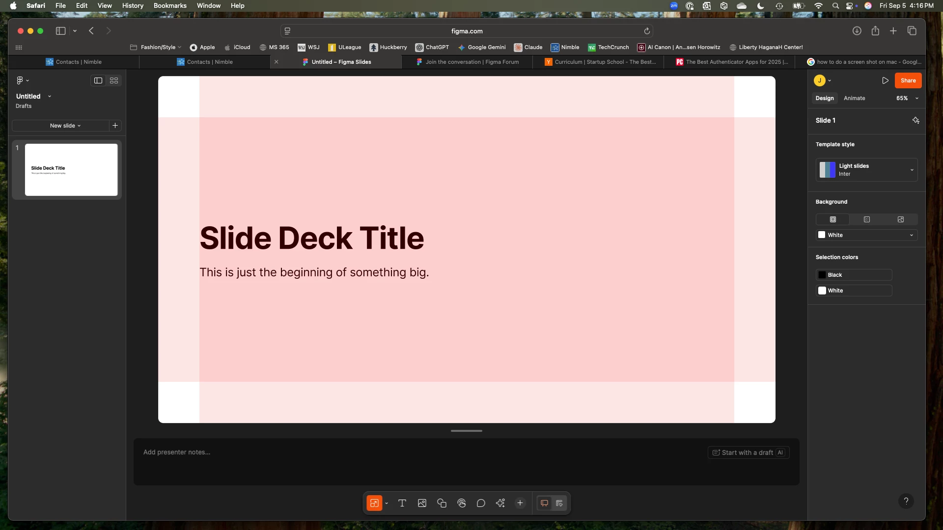 I have run into an issue where all of my figma slides have a pink hue overlay. The center of the slide is a darker pink while the border of the slide have a light pink color. This appears regardless of the slide format or template I use. The color is even present on new slide files. However, the color is not there when in presentation mode. Please see attached file for an example. Seems like there should be a simple solution. I am using figma in the safari browser. Never seen this problem before. Thanks for the help.