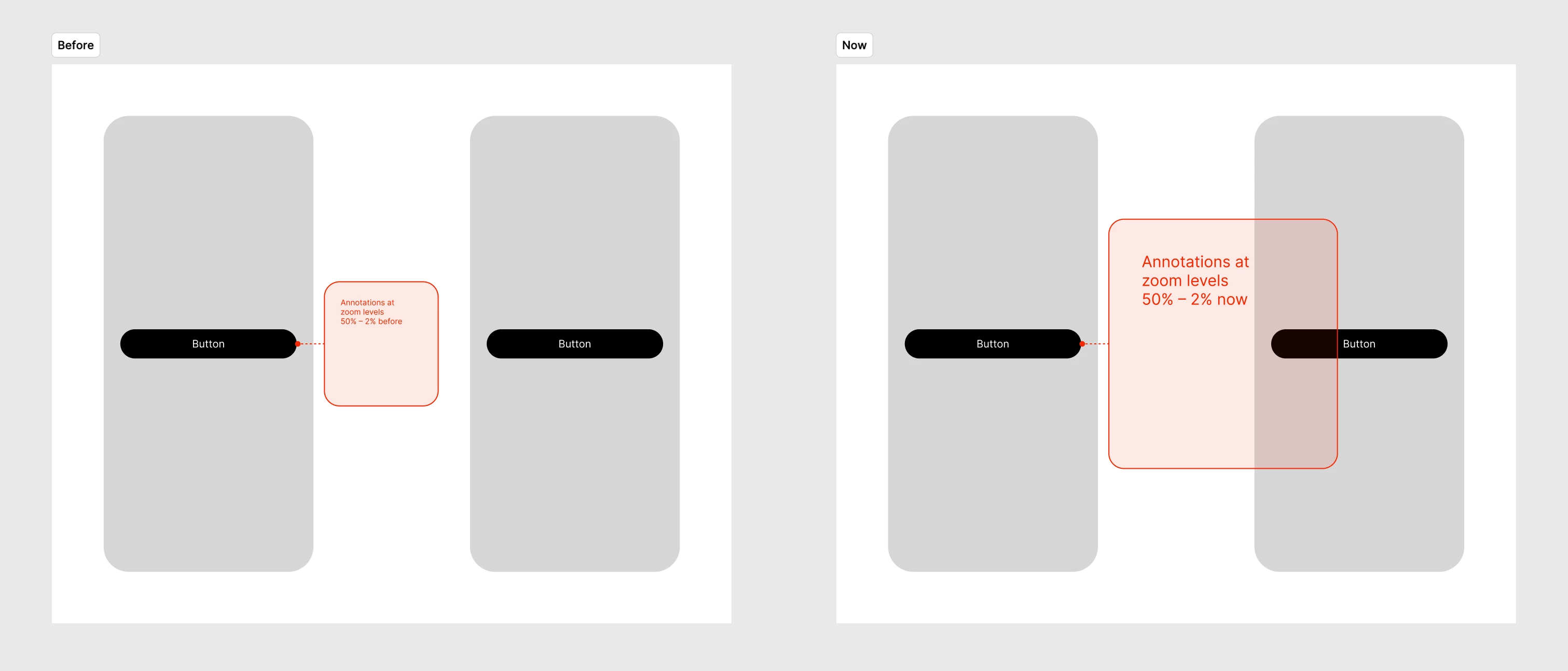 Moreover, in projects with extensive documentation, where annotations stack vertically, this behavior reaches a whole new dimension (literally, the Y axis 😅). It causes situations where zooming in on a screen to a readable size (between 100% and 50%) makes it impossible to see annotations because they keep their maximum size down to 50% zoom scale.