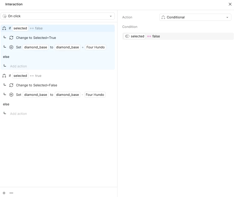 I have a prototype where I want to give users the ability to select and unselect add-ons, at their discretion. I have a button instance with True and False values, a base price for the product diamond_base, and want to update that value by 400, depending on if the button is selected. I have tried all manner of things and the closest I’ve gotten is: Button is True and the value is added, the Button is False and no value is removed, Button is True again and the value is added again, but the price never decreases. All this takes place on the Click interaction. What might I be doing incorrectly?