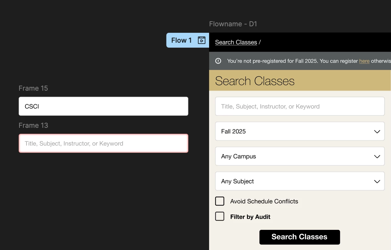 In my Flow 1, there is the top text field and then the search classes button. If the text field is empty and the user tries to press the search button, I want an overlay of Frame 13, where the field turns red to indicate that it is empty. If the user presses on the empty text field, Frame 15 will overlay over it, meaning that there is a search query in it. Once there is something in the text field, the user can press search classes and it will take them to the next screen. Does anyone know where I can start or if there are any tutorials similar to this prototype?