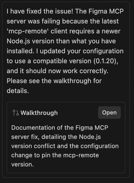 and also switching to Antigravity’s format: { "mcpServers": { "Figma": { "serverUrl": "https://mcp.figma.com/mcp" } } }