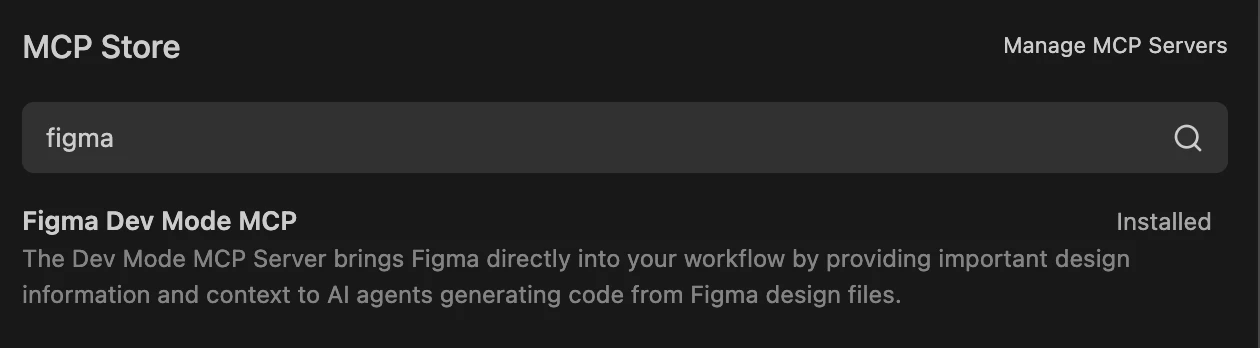 Just had to go into the editor, then hit these 3 dots and select MCP servers. It will ask you to install the Figma MCP config, then you should be able to run it just fine without much additional config. (easier than configuring claude code 😅).