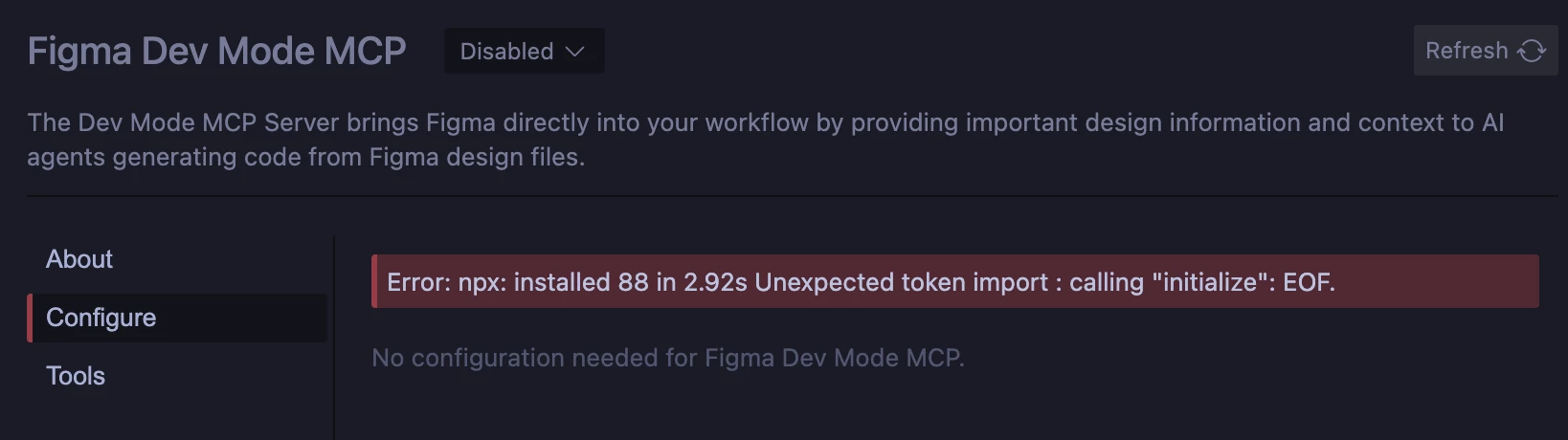 I ended up building this repo locally: https://github.com/GLips/Figma-Context-MCP.git Using the absolute path for Node (since I'm using NVM and Antigravity couldn't find it some how...), and clearing out the welcome messages that break the protocol.