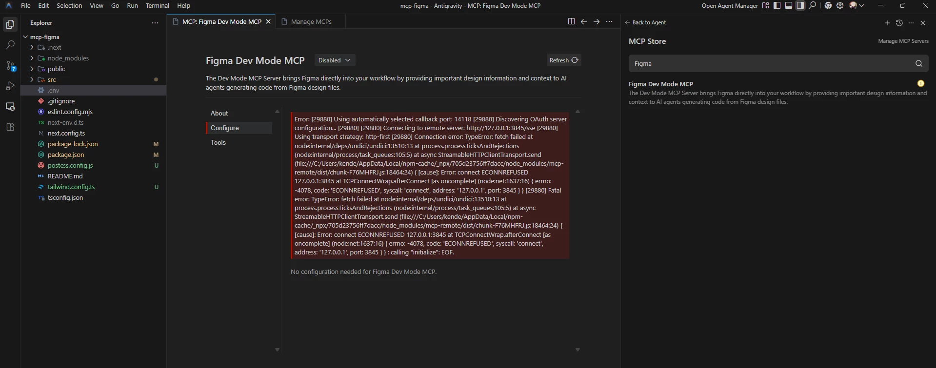 I did somehow find a way to overcome this. first check if you have node.js installed. try uninstalling the figma mcp on your antigravity and disable the mcp server in figma. close both applications and try installing the mcp server in antigravity it would most likely fail after that enable the mcp server in figma and refresh the mcp in antigravity. it should work