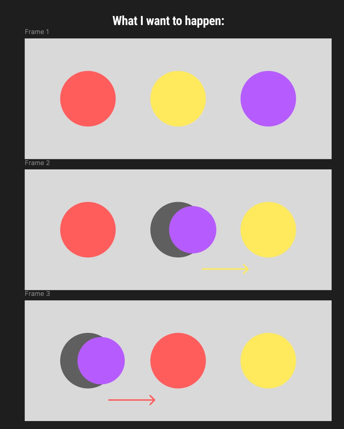 What I am “doing” is dragging the purple circle. I need to get it over to the first place (where the red circle is). When dragging, once the purple circle is dragged near the second position but NOT dropped, the yellow circle should react and move to the third position.