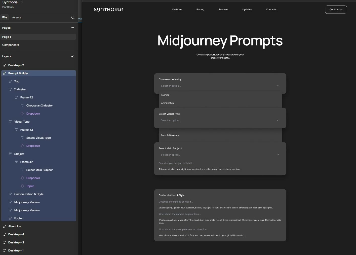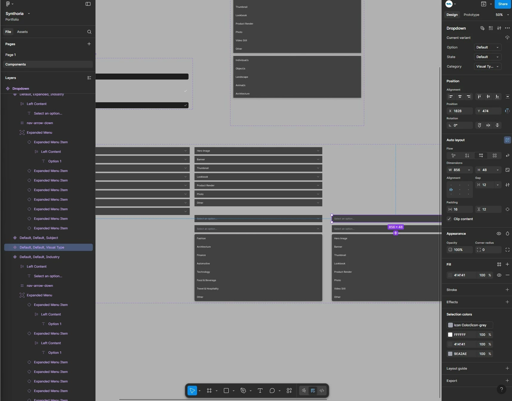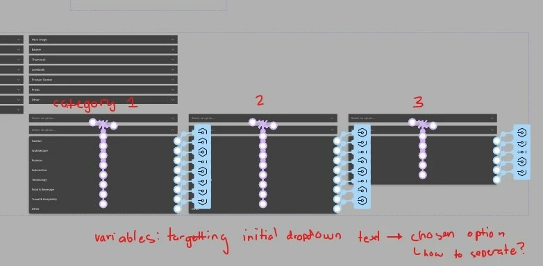 And I’m also trying to figure out why every time I press an option, all 3 of my dropdowns go to the selected options as opposed to 3 separate options. I understand that this is a variable problem, but I’m a bit stuck. I have one variable for the state (expanded, default), one for the category (industry, visual type, subject), and I believe I need one more so that each selection stays within its corresponding category after picking an option.