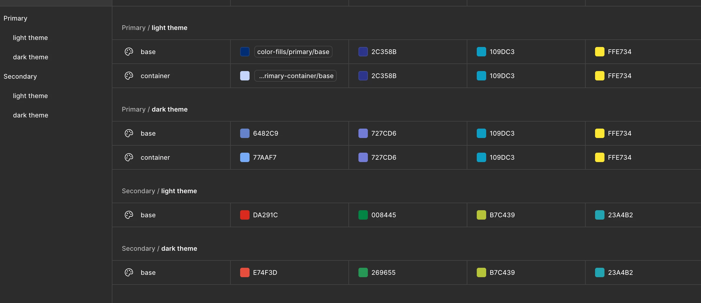 I created a default collection with light/dark theme that uses our primary and secondary colors. I made a second collection with primary and secondary colors to swap out for quick tests or demos..but at that time we were limited to 4 modes. so the ‘modes’ were the companies and the variables were grouped in primary- light theme/ dark theme, secondary- light theme/ dark theme.