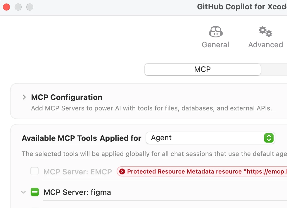 I love Figma MCP server on Windows side of development but now I would like to use it for XCode and iOS. I have successfully configured Github Copilot for XCODE and using that I have specified the typical Figma MCP setting but no tools show up.