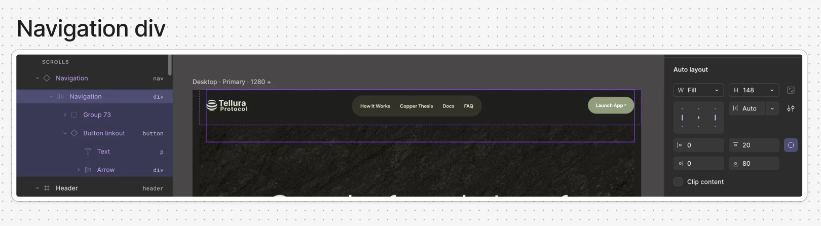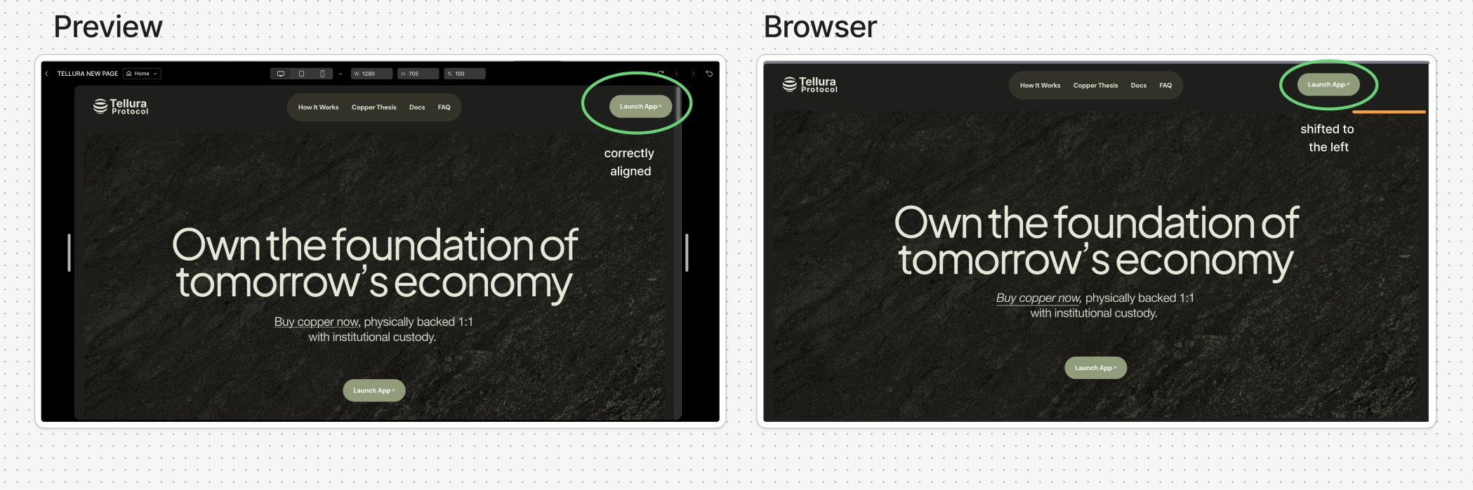 If I resize the browser from Tablet back to Desktop, every other element adjusts normally except this button. It seems to “hit a limit” on the left side and won’t move further right, even though it’s centered inside the Figma canvas.