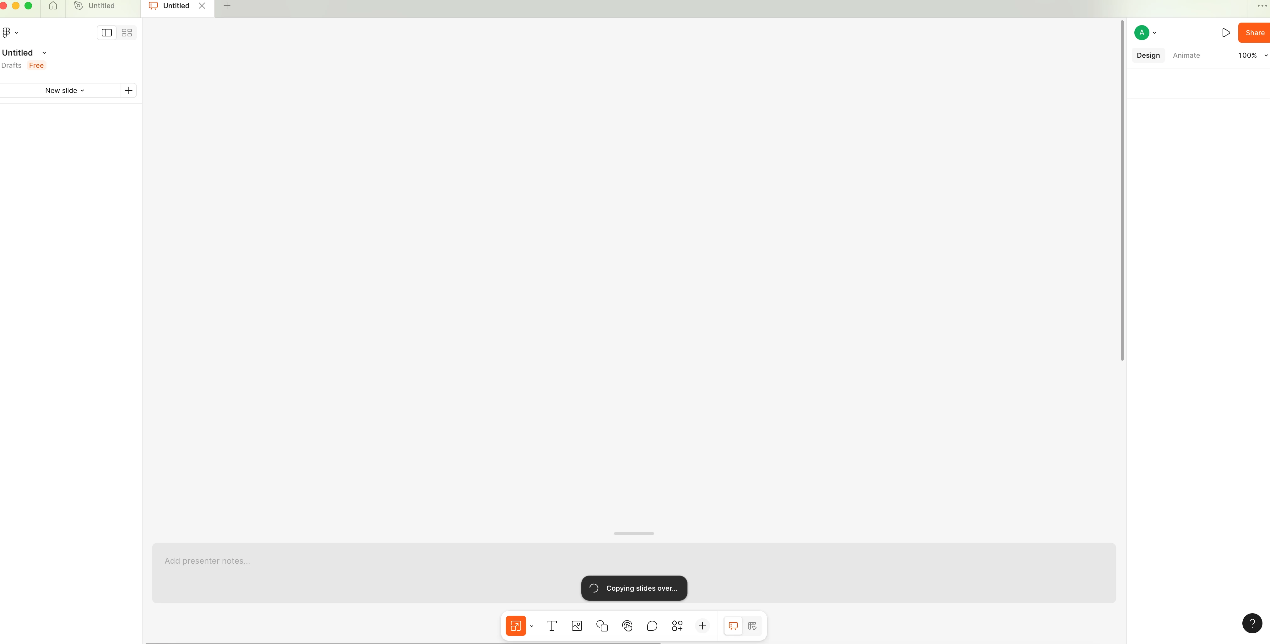 From what I understand, you’ve created a presentation in Figma Design and are now trying to copy content into Figma Slides — but you’re getting stuck on the “Copying slides over…” message. I tested a few variations on my end (copying frames, components, and prototypes between files) and things worked as expected, so let’s narrow this down a bit more together: