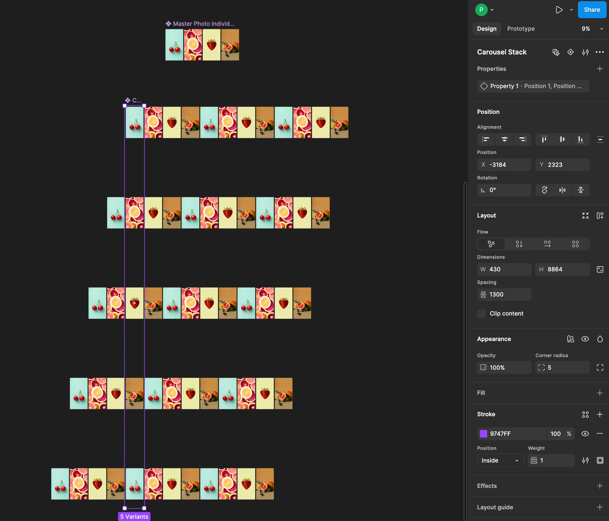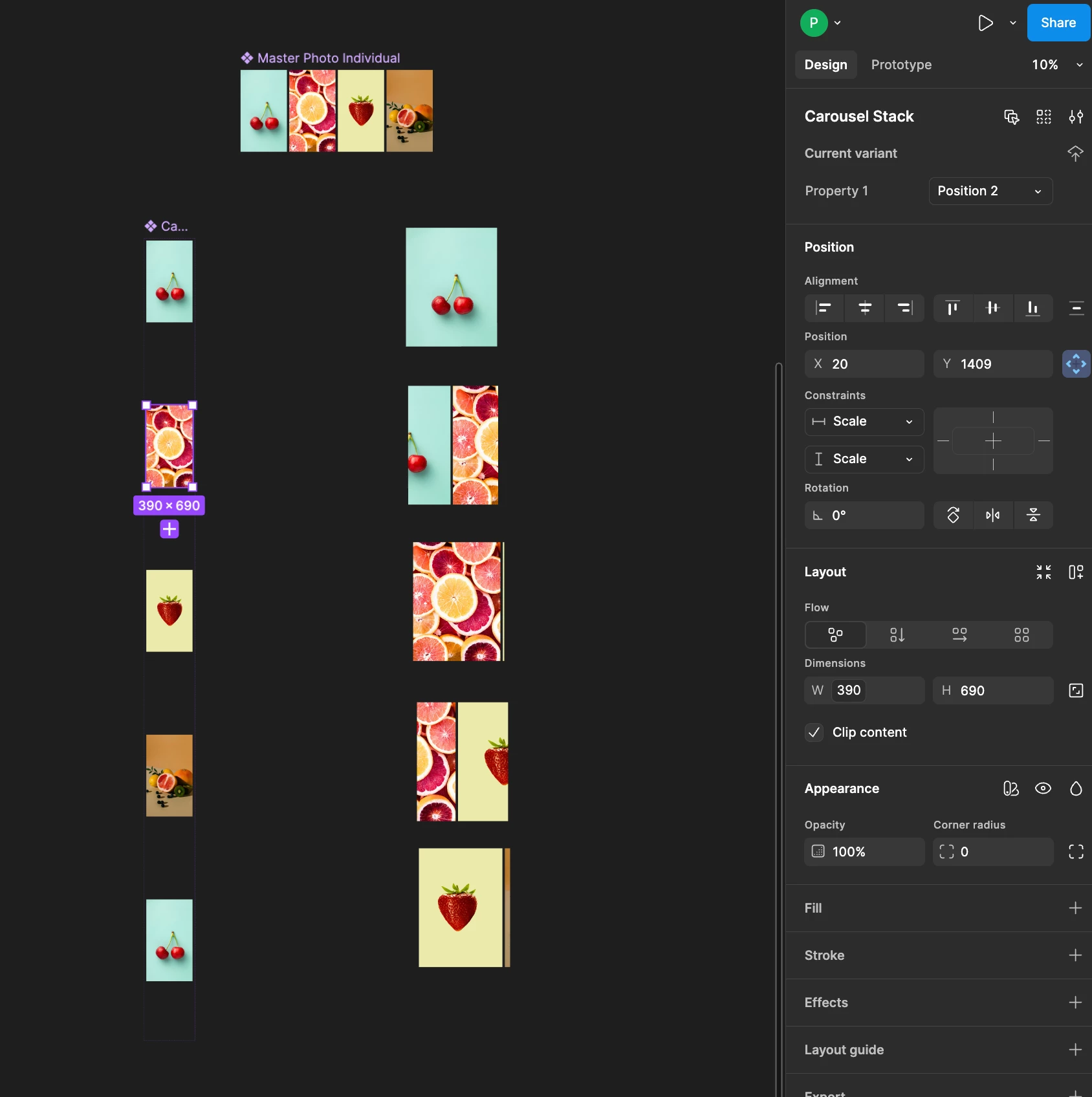 In the second screenshot you can see that I have clipped the stacked component so you just see five images. I have moved an instant of each of the variants to the right of the component and changed the mode of each one from Mobile to Tablet. At this point you can see that the first variant with the cherries behaved normally but each consecutive variant only changed by a fraction thus landing between images.