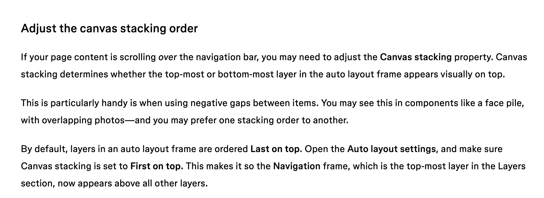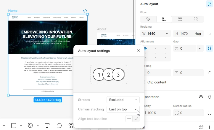 - Open the Auto layout settings, and make sure Canvas stacking is set to First on top.