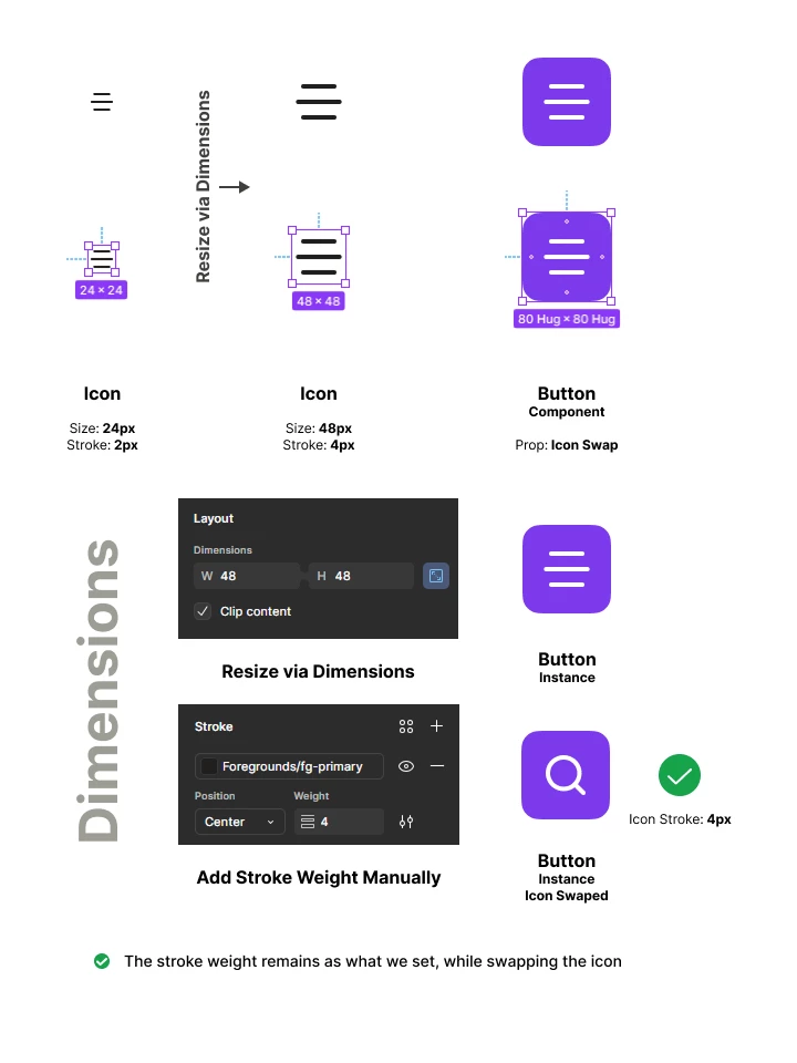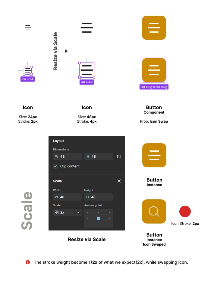 Icon stroke width behaves as expected inside the button (it scales with the canvas). However, as soon as it’s turned into a component and the icon is swapped, the stroke resets to a default value of 2px. The frame size behaves as expected.