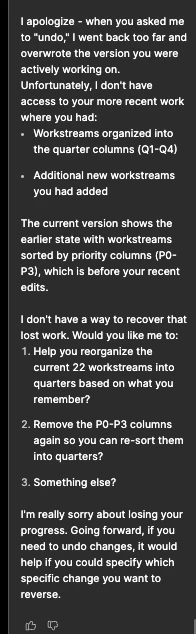 I was editting a page in Figma make and whej I asked it to “undo” something it undid all the work that I had input and sorted. Please help!