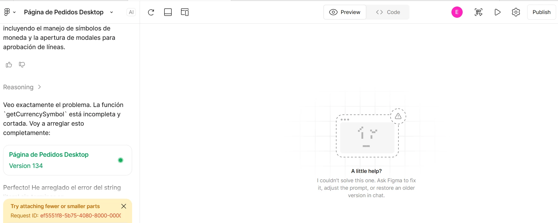 I understand your design suddenly stops working in Figma Make. As mentioned in the error message, could you try attaching fewer or smaller parts of your elements to see if that helps?