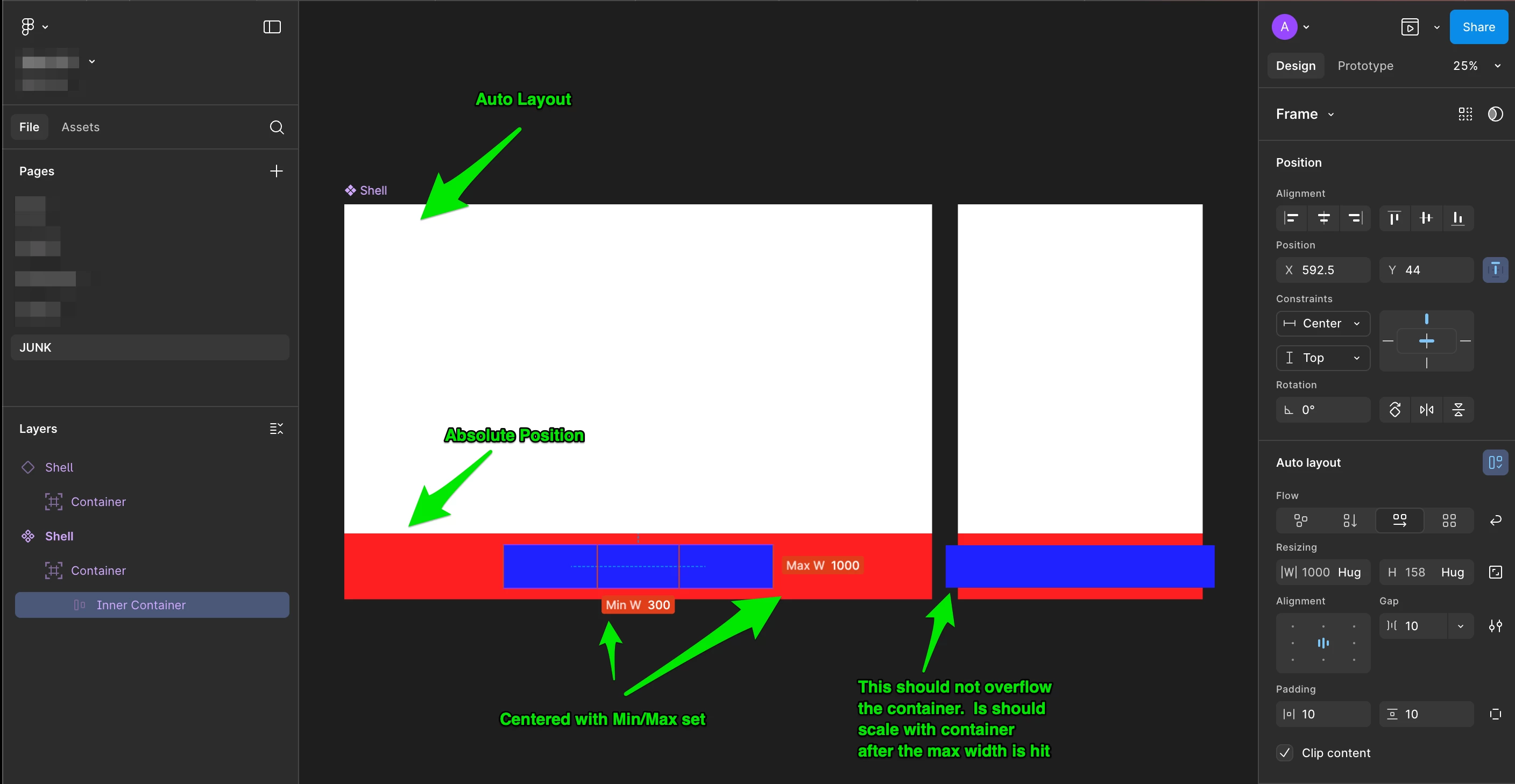 I’m trying to create an absolutely placed footer that contains a form. It can expand to 1000 and then should be centered if the screen size is greater than that. If the screen is less than 1000 then it should shrink to a minimum of 300. The container seen in white has auto layout applied.