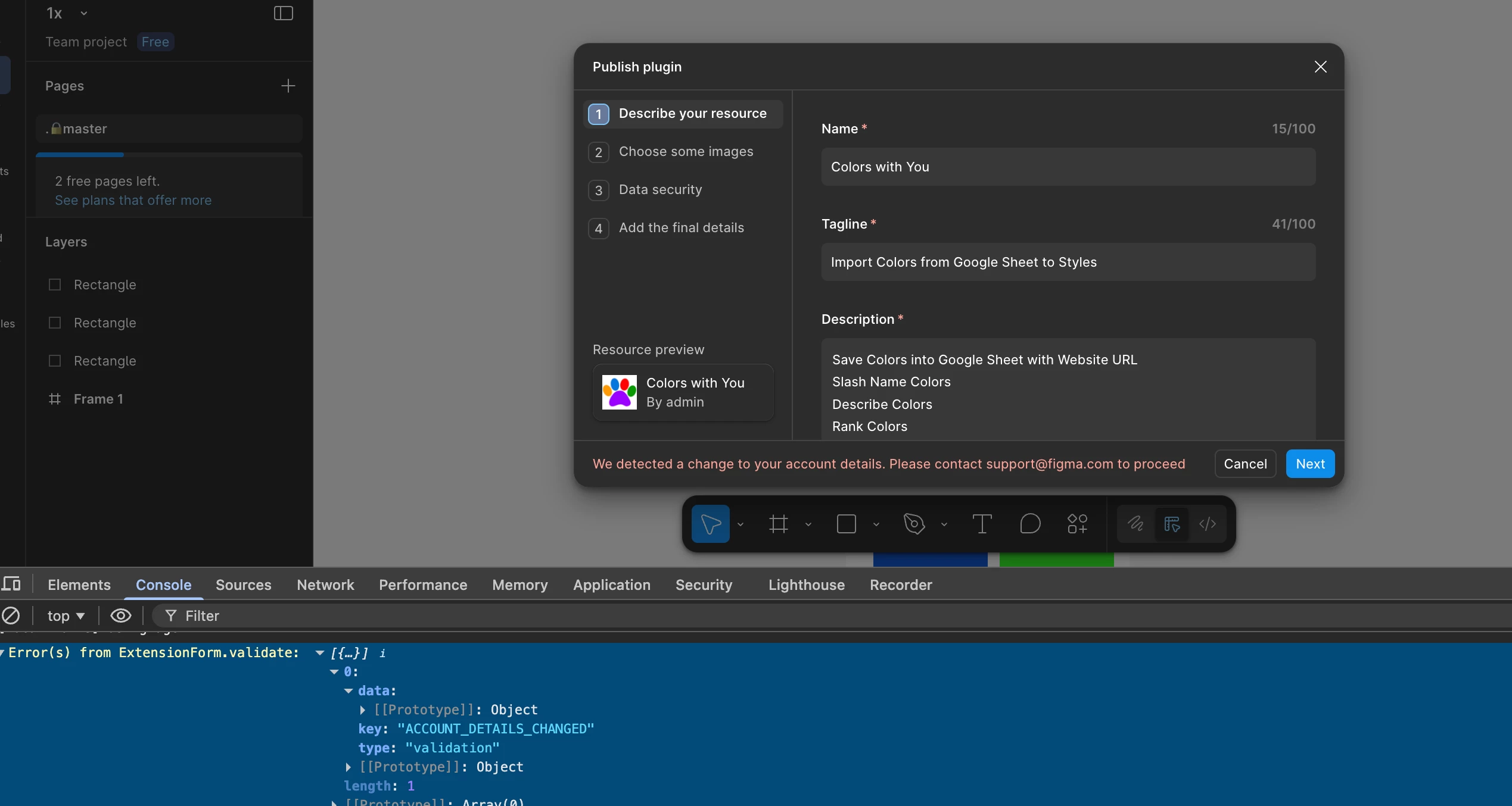 I tried updating the manifest to match my plugin ID and I was able to get the “Publish a new version” option and now I am getting an error