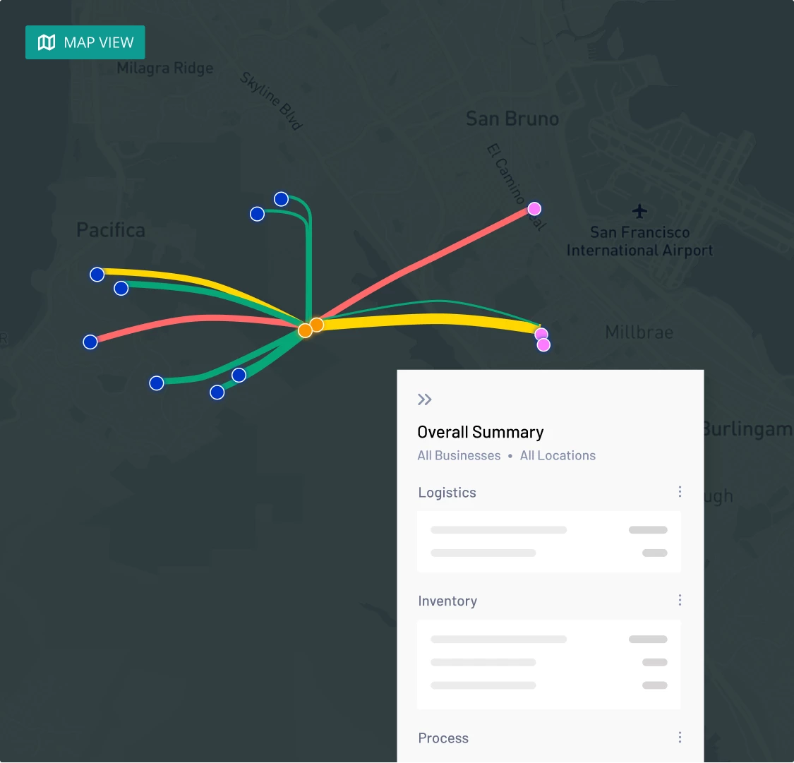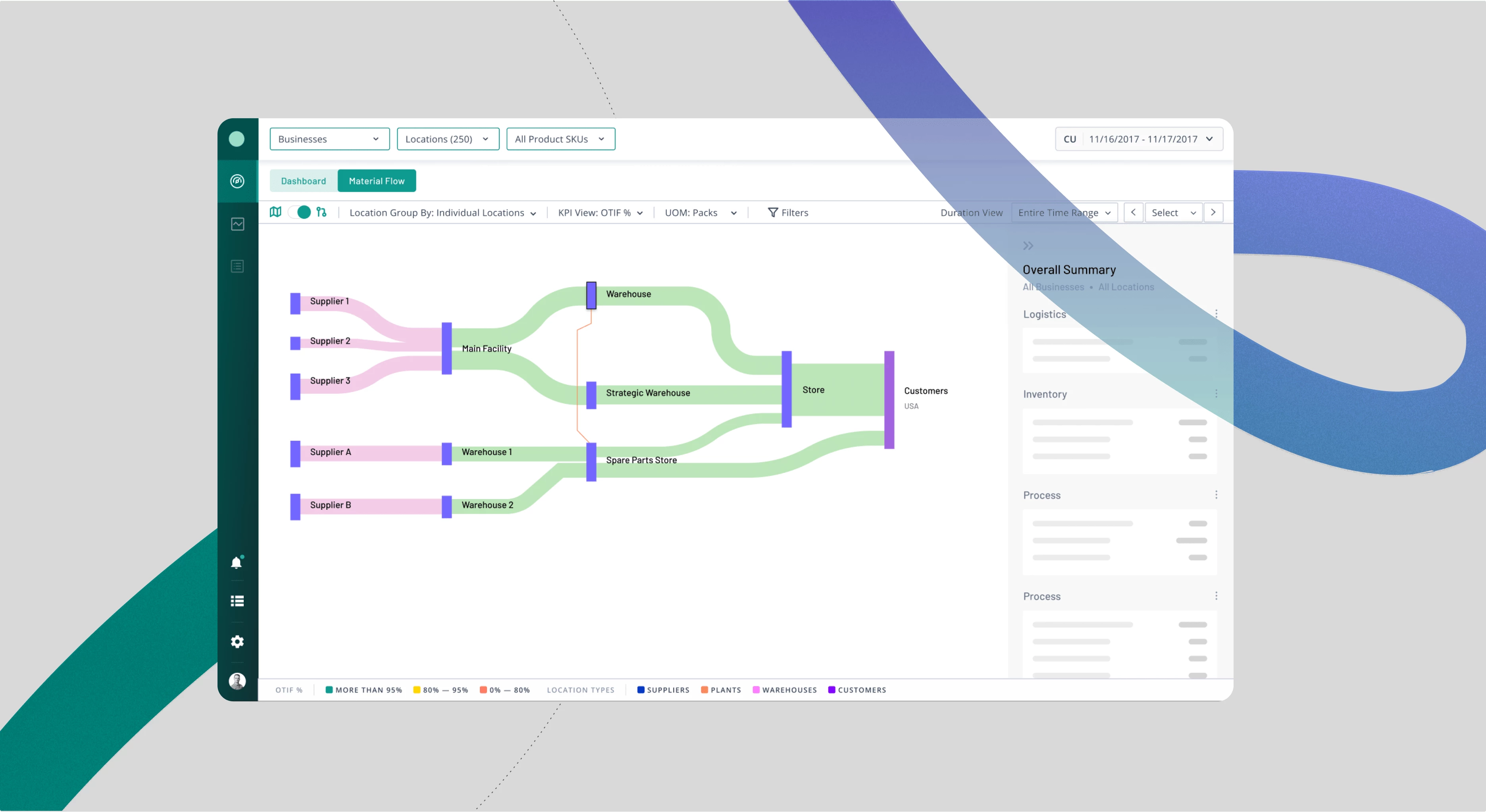 This visualization aids users in identifying logistics issues, whether they involve internal flows (plant to plant, plant to warehouse) or external flows (warehouse to distributor, POC, plant to POC).