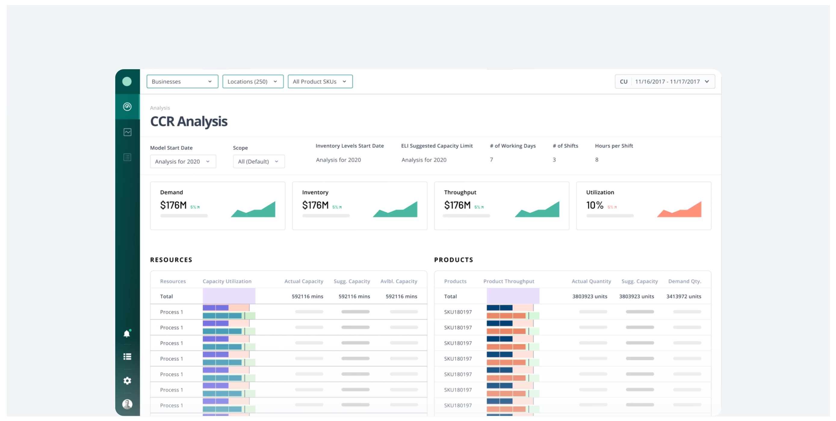 The CCR Analysis enables you to play around with certain manufacturing parameters and formulate the most ideal utilization and production conditions that will help boost productivity and meet Demand while also potentially reducing Working Capital