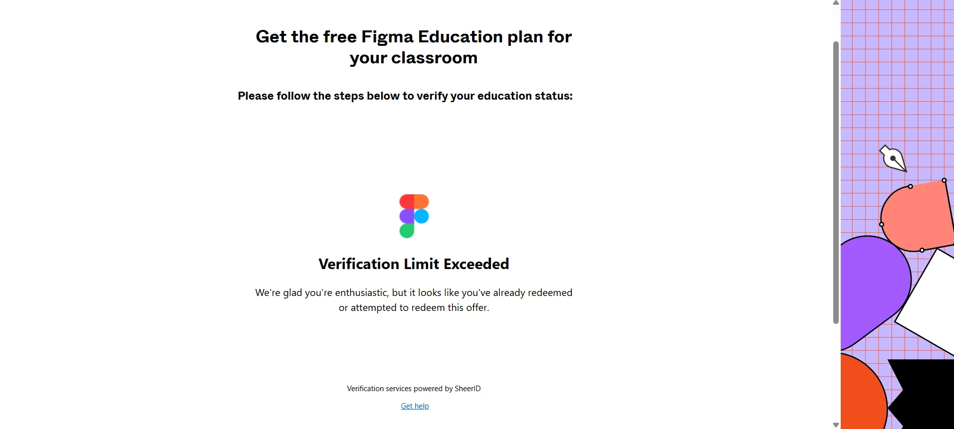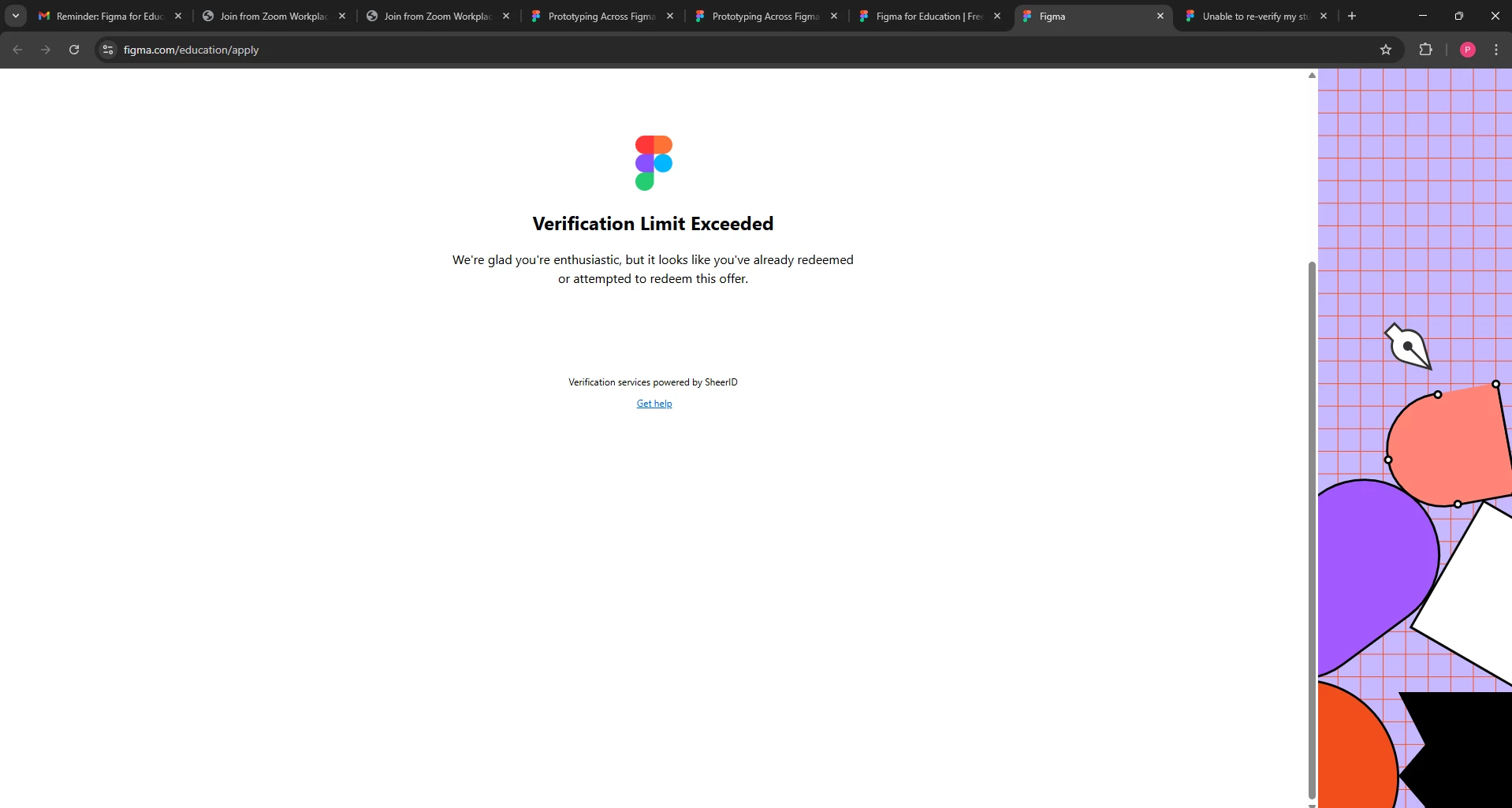 I’m stuck on the SheerID step with the error “Verification Limit Exceeded / already redeemed or attempted” when applying for Figma Education.