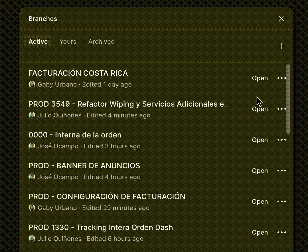When I try to open a branch from the main file by clicking “Open,” nothing happens. There’s no loading state or error message, it just doesn’t respond.