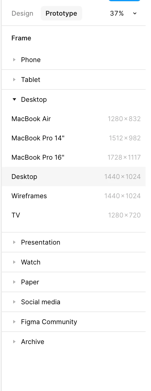 I am designing a website with the Desktop frame and when I go to its prototype panel, under Prototype setting, the “Desktop” option is gone. I hope this will be fixed soon.