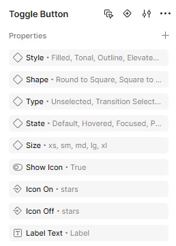 I want the icons in the button's unselected states to be outlined and the icons in the selected states to be filled. To achieve this, I couldn't create a single instance swap property, because that way all the icons would share the same icon style when I changed one. So I created two instance swap properties: