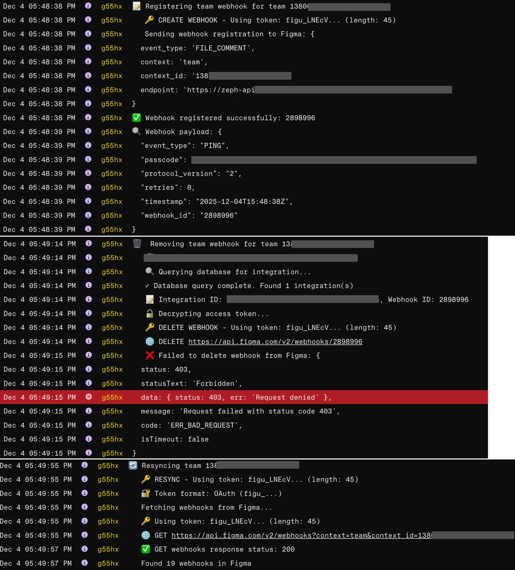Now I've got 18 orphaned webhooks, created when trying to test and fix this issue that I can't delete programmatically. Eventually I'll hit the 20 webhook limit per team, and I'll be stuck. My apps ignores the webhooks I don’t need but this is clearly not an ideal scenario – it is a strain on Figma’s resources and I wan’t my app to be able to gracefully remove the integration.