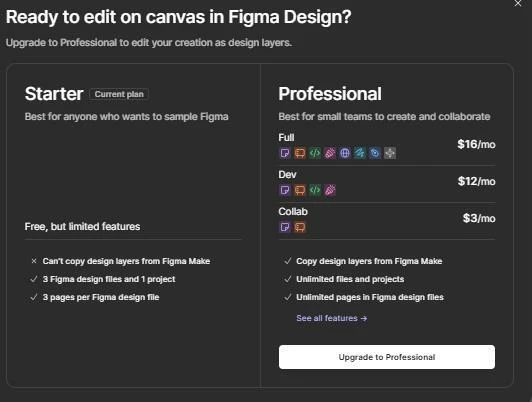 I understand you’re seeing an upgrade modal when you click “Copy design” in Figma Make.