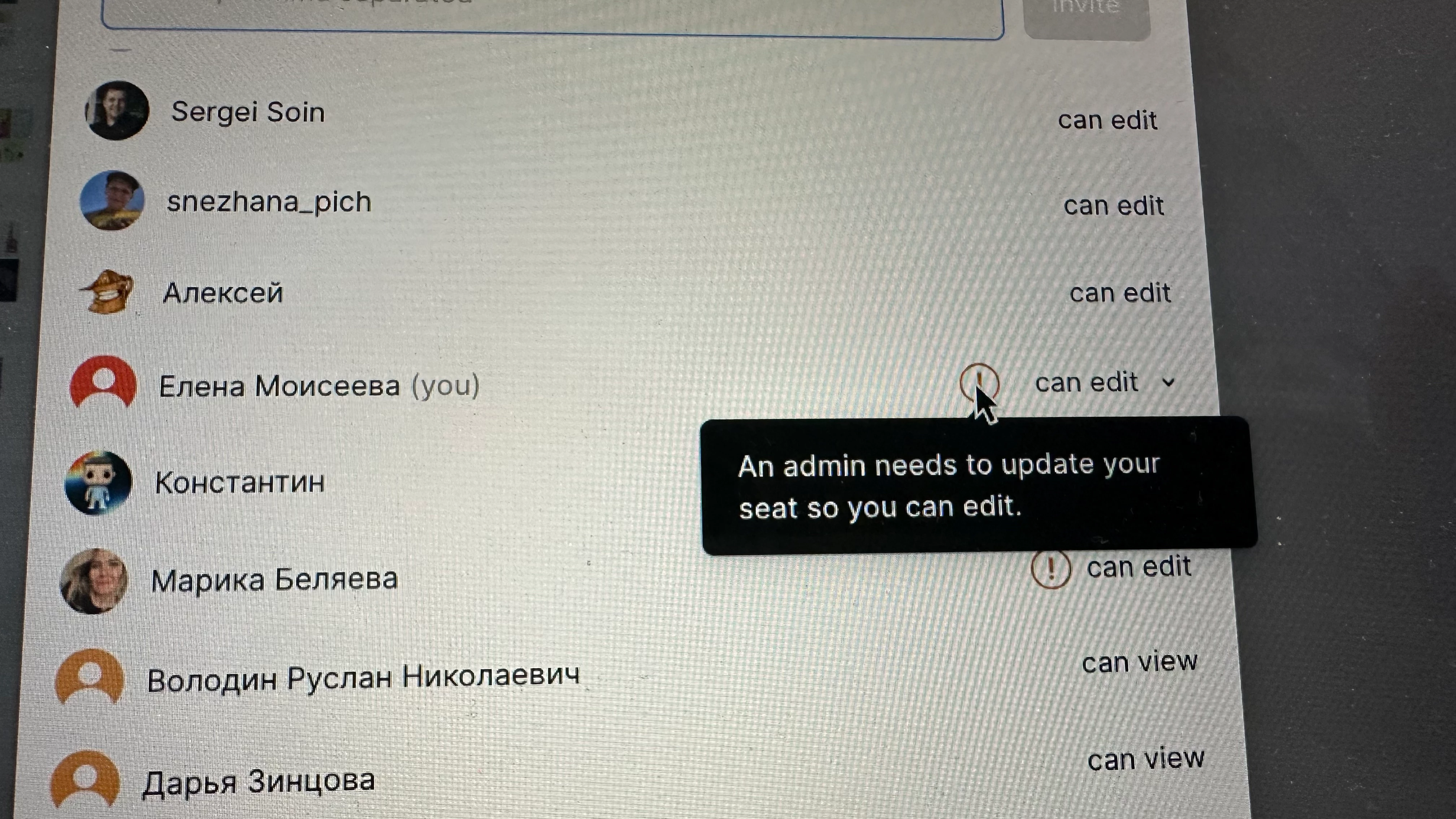The client has shared a file with me and given me “can edit” rights, but I cant edit. I am getting this error “An Admin needs to update your seat so you can edit file”. Any ideas? Thanks