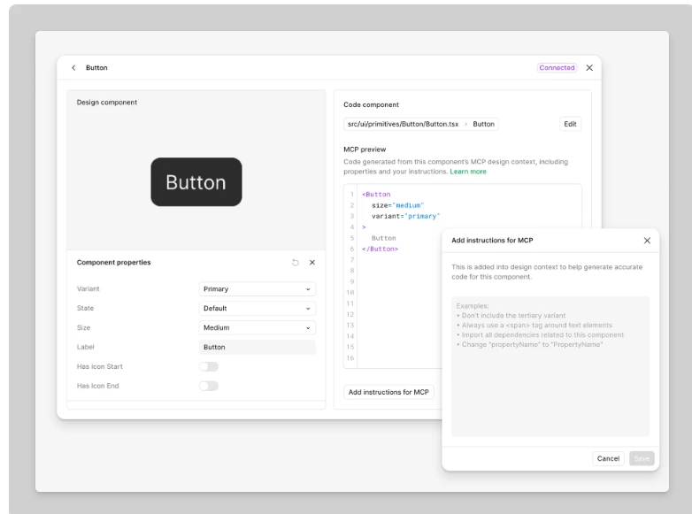 there should be a Add instructions for MCP button in Code Connect UI to steer LLM code gen