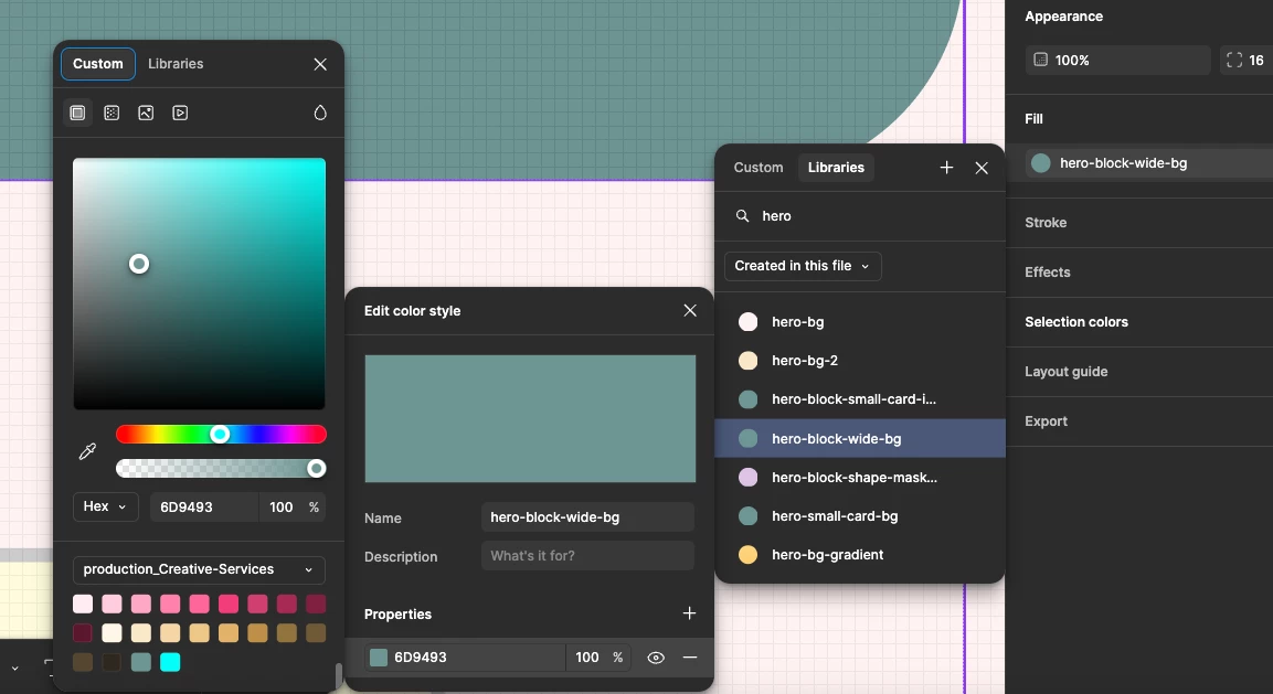 “dark teal” only shows up as a fill style where i would select “hero-block-wide-bg” color fill,