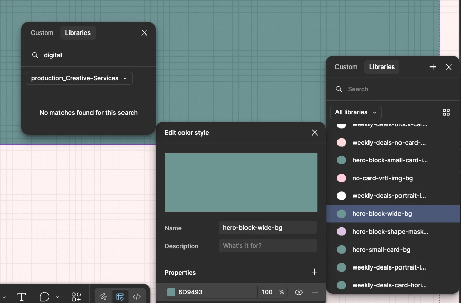 current workaround is the “dark teal” from the library shows up under “custom”, but then just fills with the hex which isn't ideal for QA purposes - (but is working as designed by figma) - which is why i would like the above issue to work properly so i can assure the library specific color is being used. (second to last palette color in the screenshot)