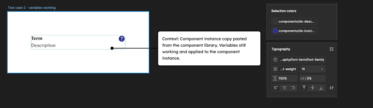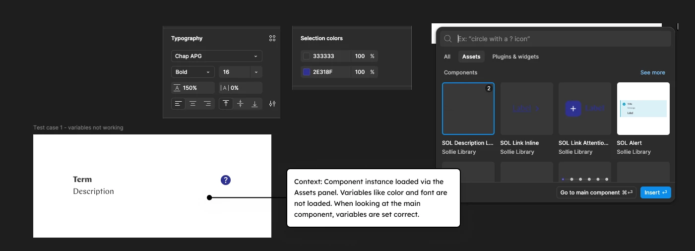 When loading a component instance via the Assets panel, variables like color and font-family are not loaded. When looking at the main component in the component library file, variables are set correct.