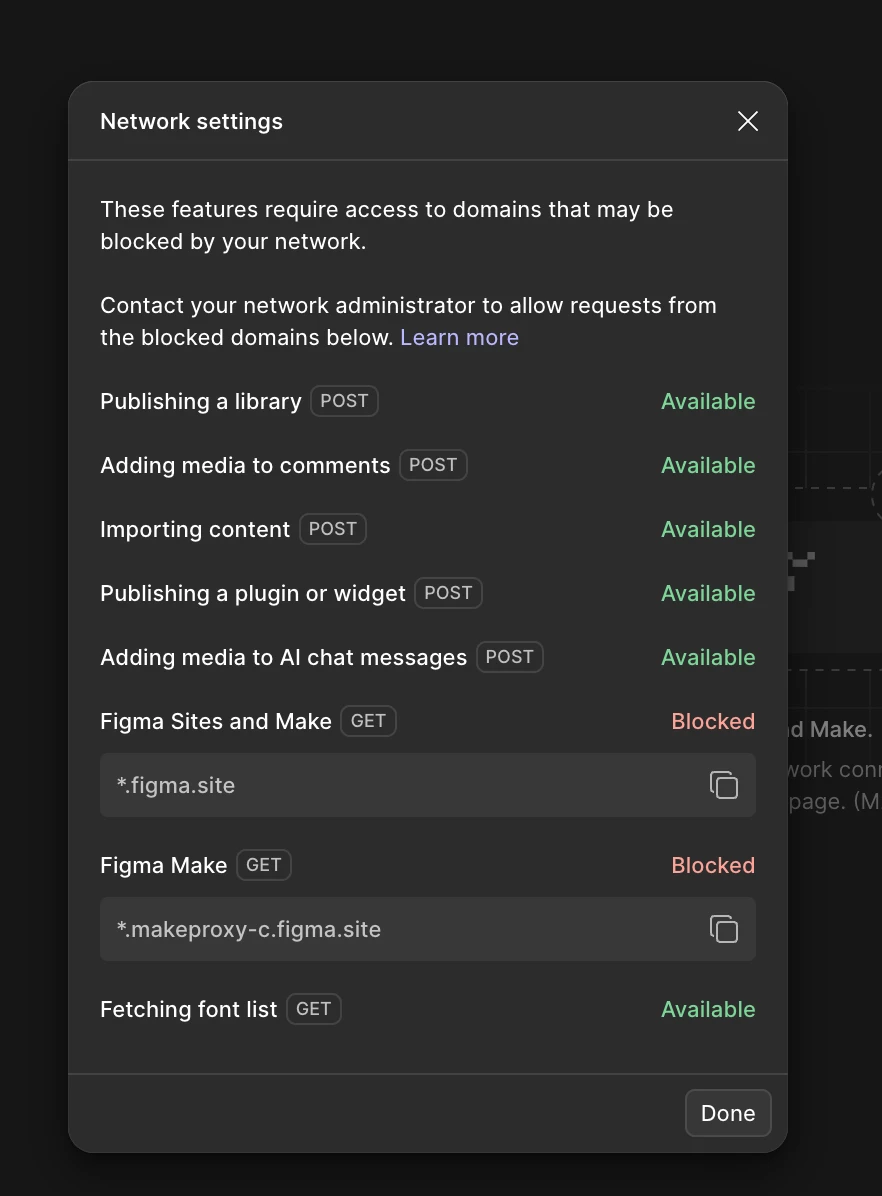 If you’re still unable to load Make previews, it’s likely due to network restrictions. Check your network settings and make sure required domains are allowlisted (you may need help from your IT team). The network settings modal can also help identify any blocked requests.