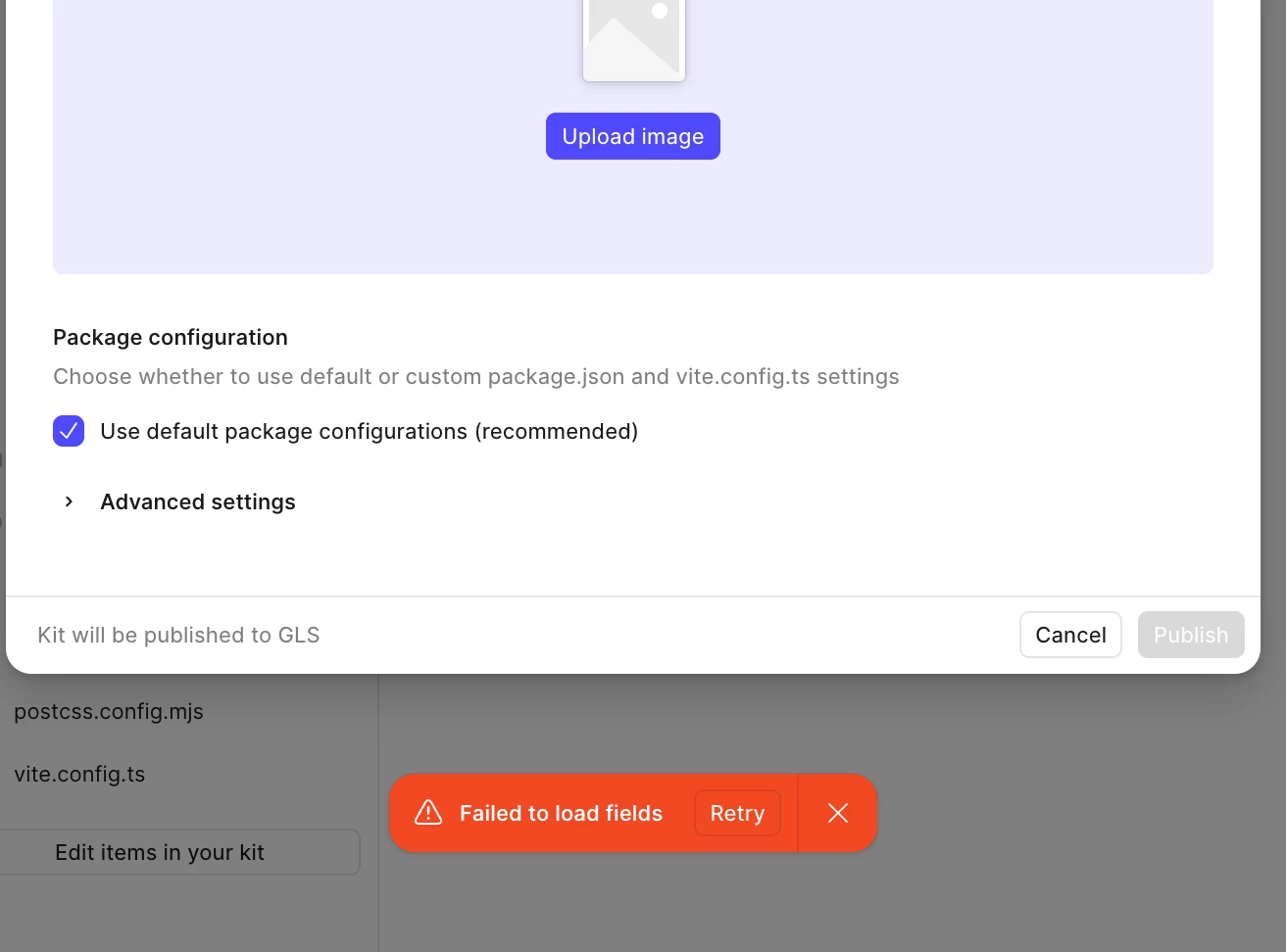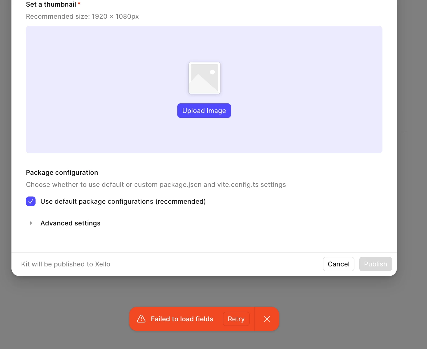 While publishing Design kit in Figma Make, after click publish, i receive "Failed to load fields" and retry action, however nothing happens after clock on retry. Also, in the modal publish action is in the disable state.