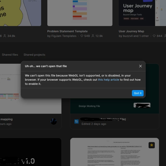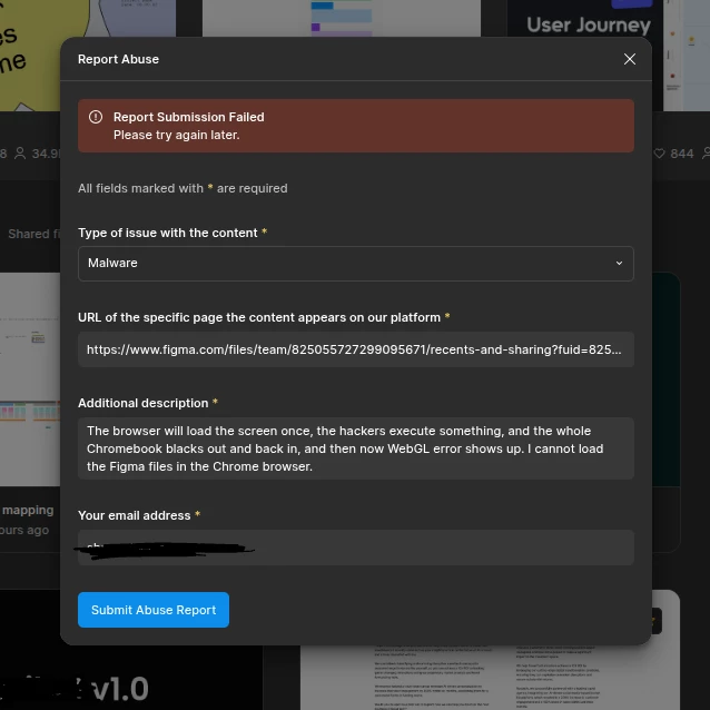 The browser will reload the entire screen in black once, the hackers execute something, and the whole Chromebook blacks out and back in, and then now WebGL error shows up. I cannot load the Figma files in the Chrome browser. The abuse form doesn't work either. Ever.