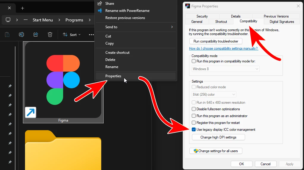 - Compatibility tab → ✅ Use Legacy Display ICC Color Management