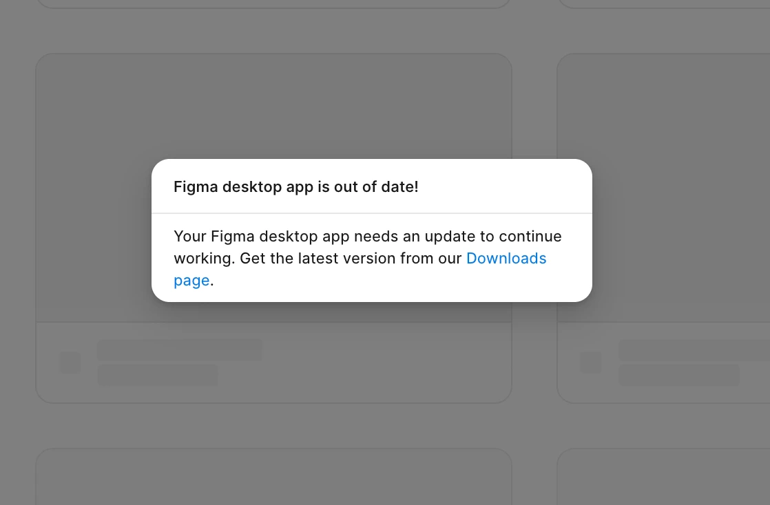 so I searched an old figma version, which is 125.4.9. This version can allow me to open, but all my figma flies are blanked, and in the middle of the window a reminder keep there and telling me “Figma desktop app is out of date.”