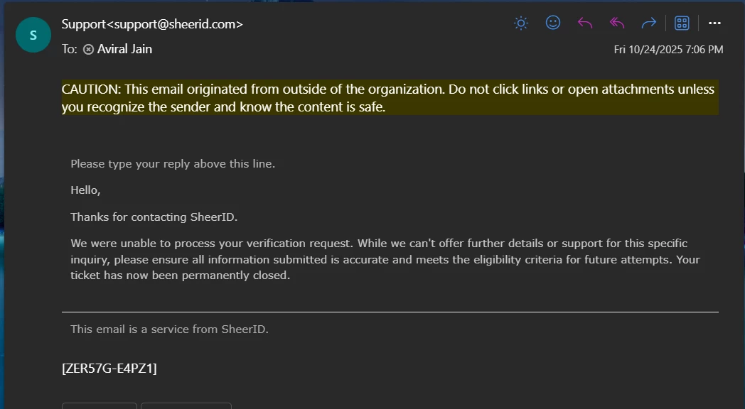 I am trying to re-verify my education status using the school email address. But it fails every time. When I connected to sheerid for this, they sent me an email stating this(image attached). Though I provided all the information needed, the sheerid is responding again and again the same. Please help and reverify my education status. I have sent them marksheet, confirmation of enrollment, and everything from my Higher Ed institution email. Still, they are denying my verification request and not stating the reason for doing so.