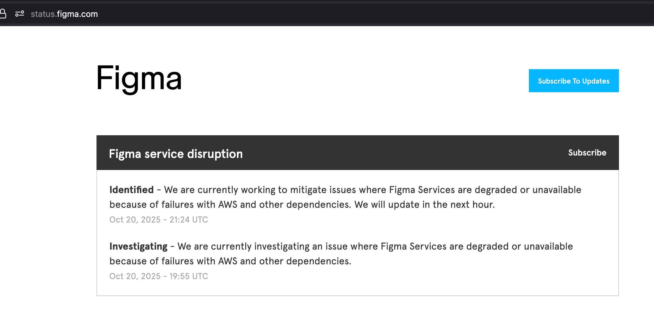 Update: Our engineering team has identified that failures with AWS and other dependencies are causing today’s disruptions. Some Figma systems have been restored, and work is ongoing to bring the remaining services back online.