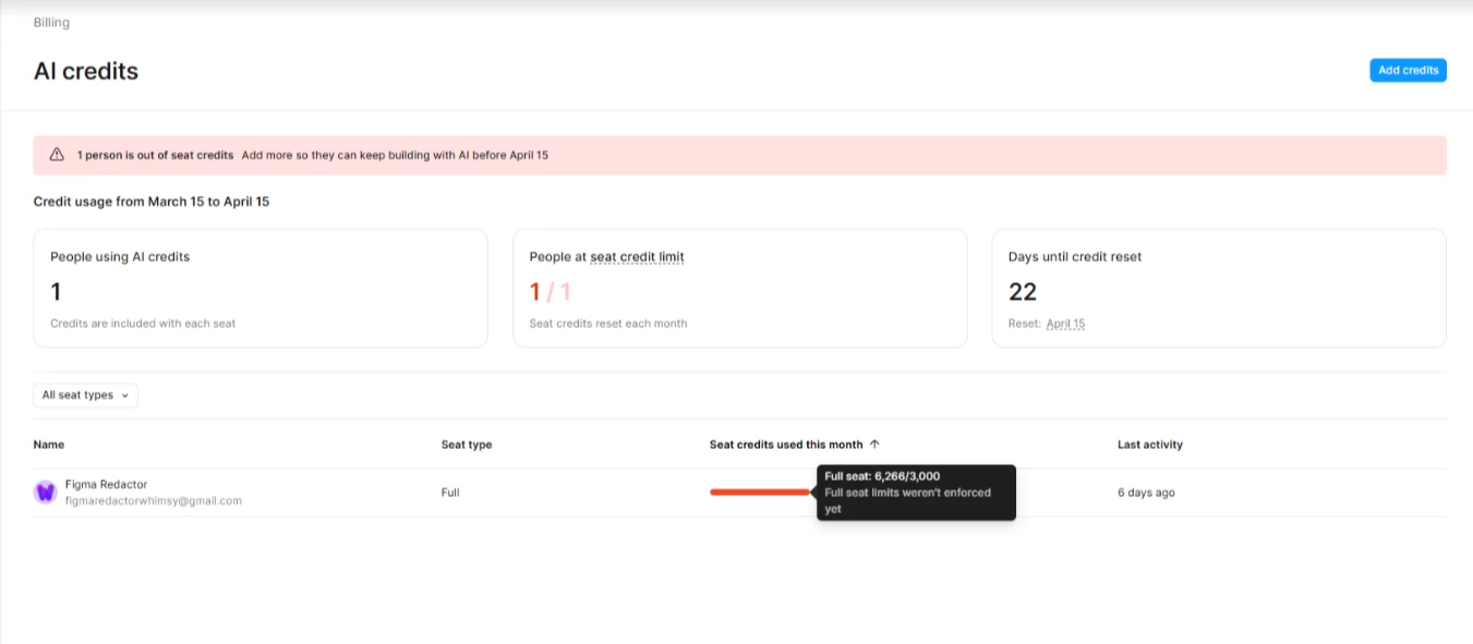 During March 2026, I used Figma Make with 1 Full seat purchased in February. At some point my credit balance reached zero, but Figma Make continued to function without any interruption, warning, or usage cap. No error messages were shown. The only information I found about this behavior was in community discussions suggesting that credit limits were "not enforced yet" during early access.