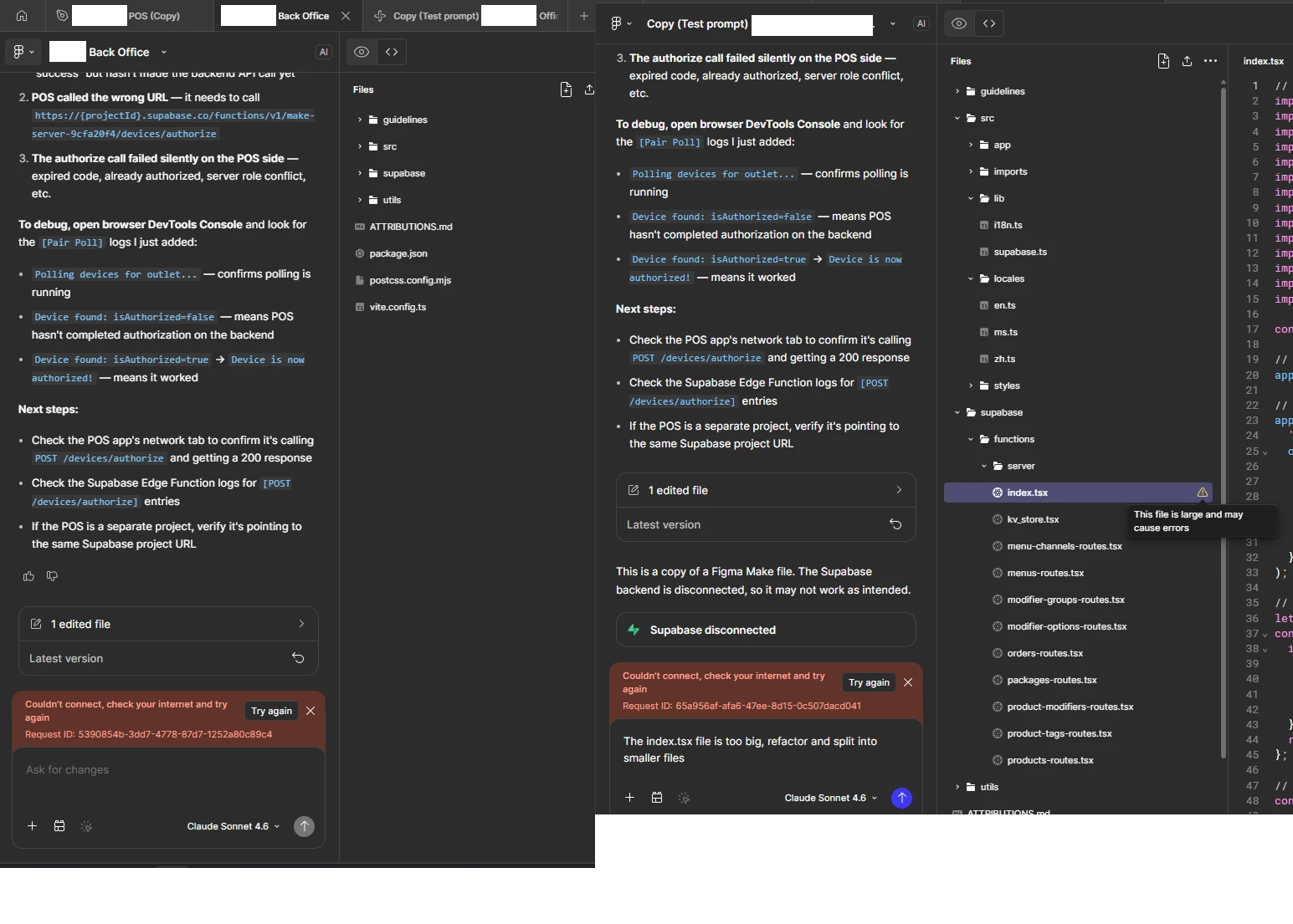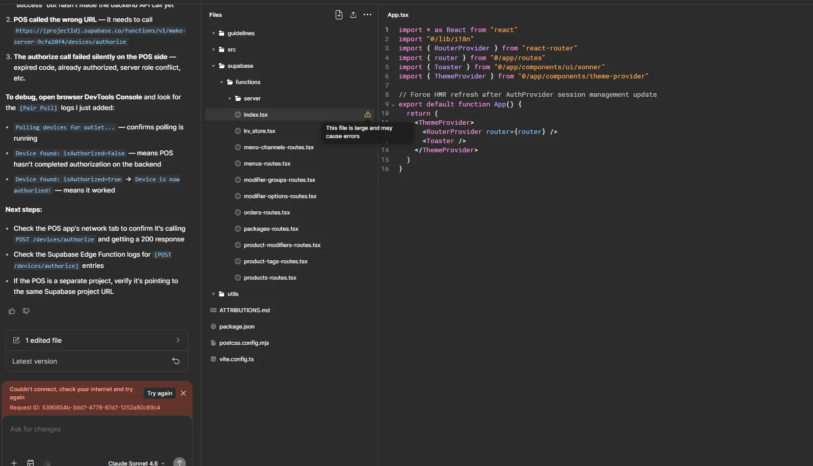 /supabase/functions/server/index.tsxdisplays a warning:“This file is large and may cause errors.”. I attempted to use prompts to fix the issue, but the same warning keeps appearing.