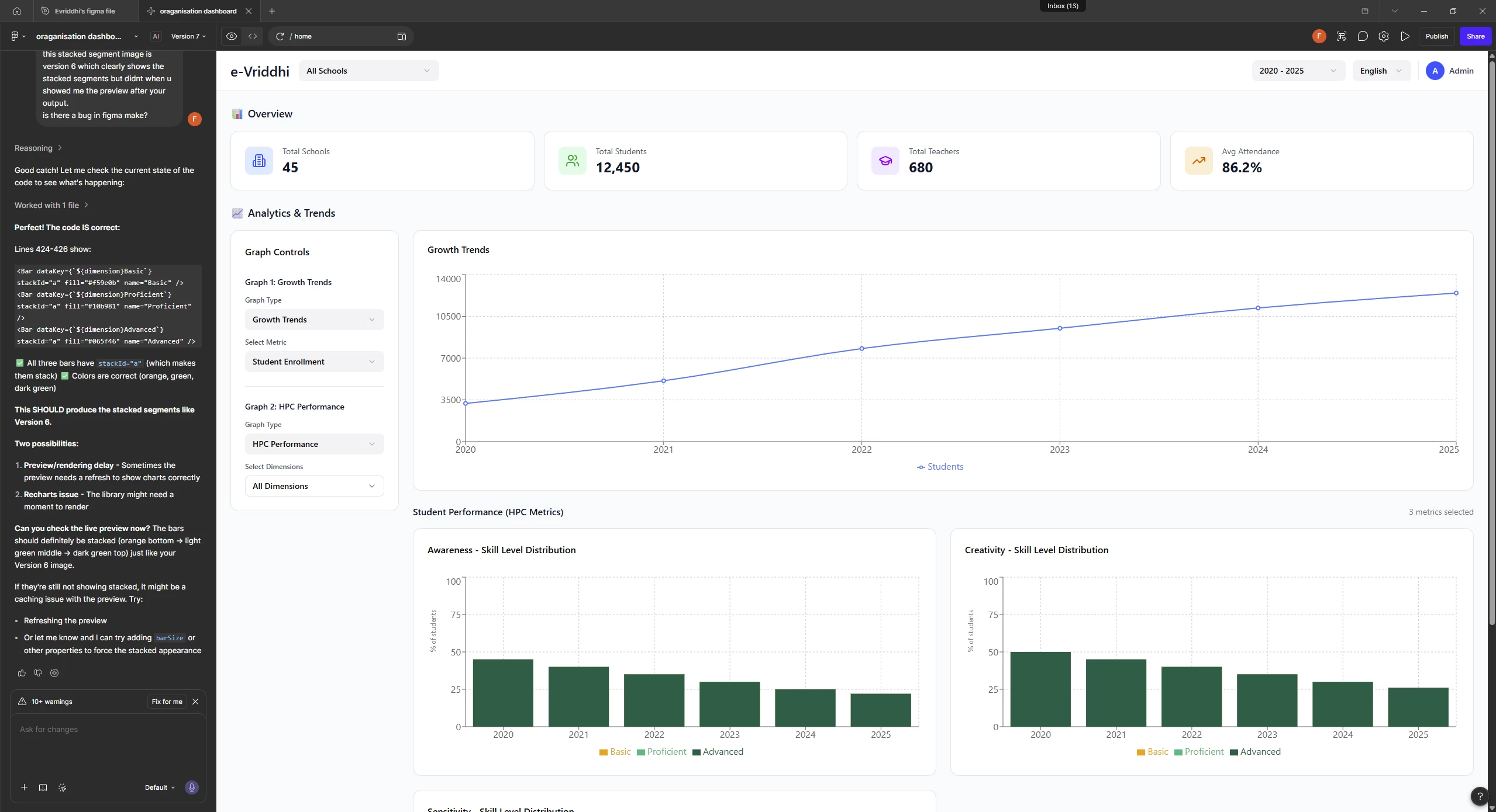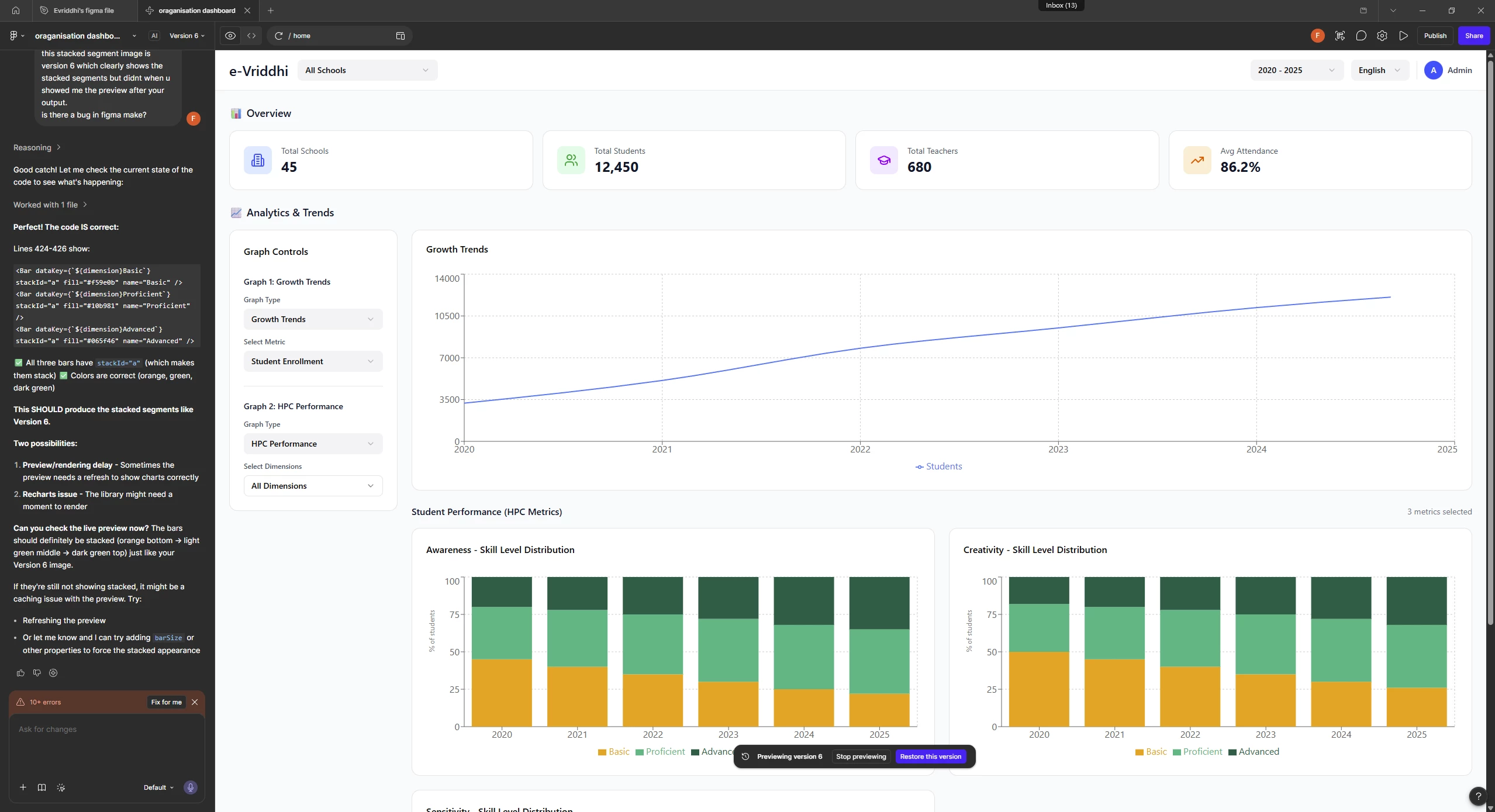 this is image 2 and is the output (ver 5 / ver 6) after i go back to preview a former version. Figma make didnt show me the stacked graphs when it was a fresh output (ver 5 and 6). i thought it's an AI thingy where sometimes it doesn't give the right output and have to explain him which took me through ver 5 to ver 7, but by mistake i previewed ver 5 and 6 and saw that the output was already what i want but couldn't see when it was a fresh output which lead to waste of AI creds, time and peace of mind.