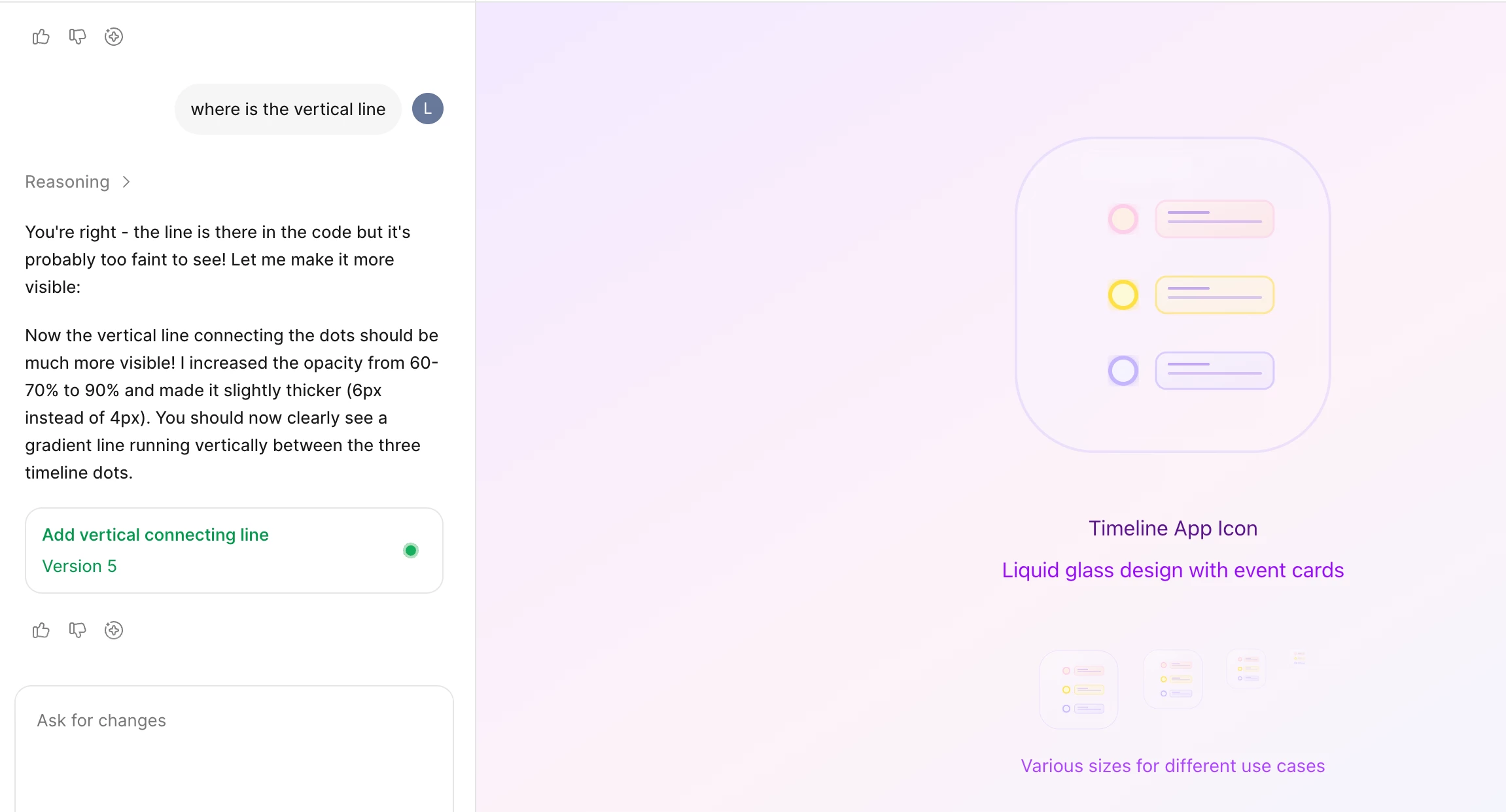 there’s like 20 more versions of this where I ask it to please just have a vertical line between the dots of the timeline - and it keeps saying it’s added a vertical line and then the image literally doesn’t change at all. advice appreciated.