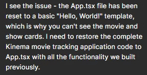 The above image is an example from one of my recent projects in Figma Make. I was building a huge movie tracker and during one of the changes, it just removed the major chunk of the app. When I mentioned it next in a prompt, this is what it replied as.