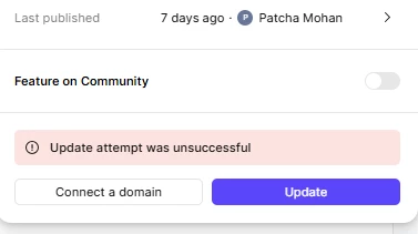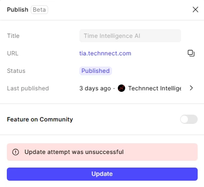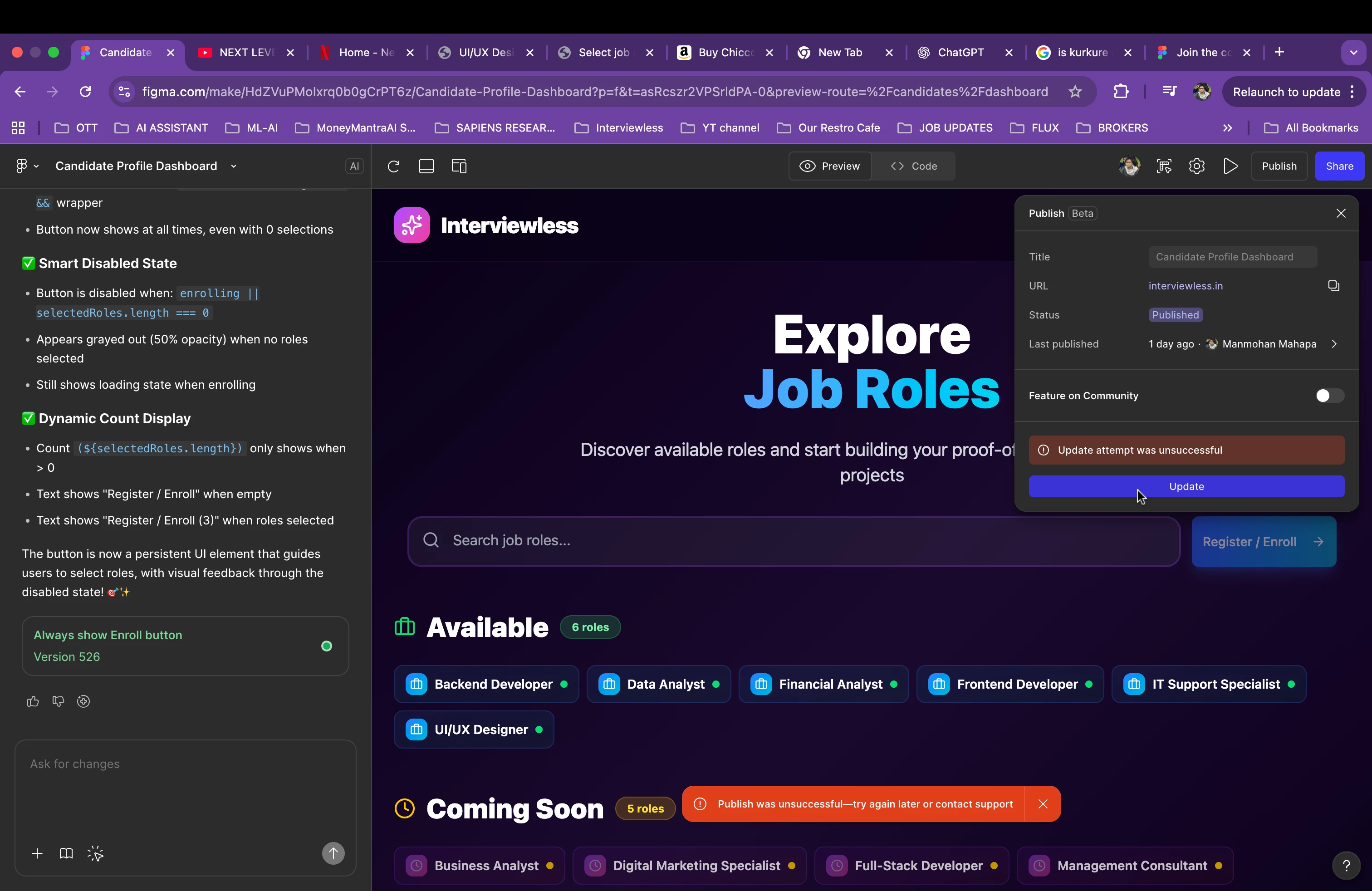 Issue: Unable to publish prototype updates via the Preview tab. Error Message: 'Something went wrong, reload and try again' (in red). Start Time: Jan 27, 2026