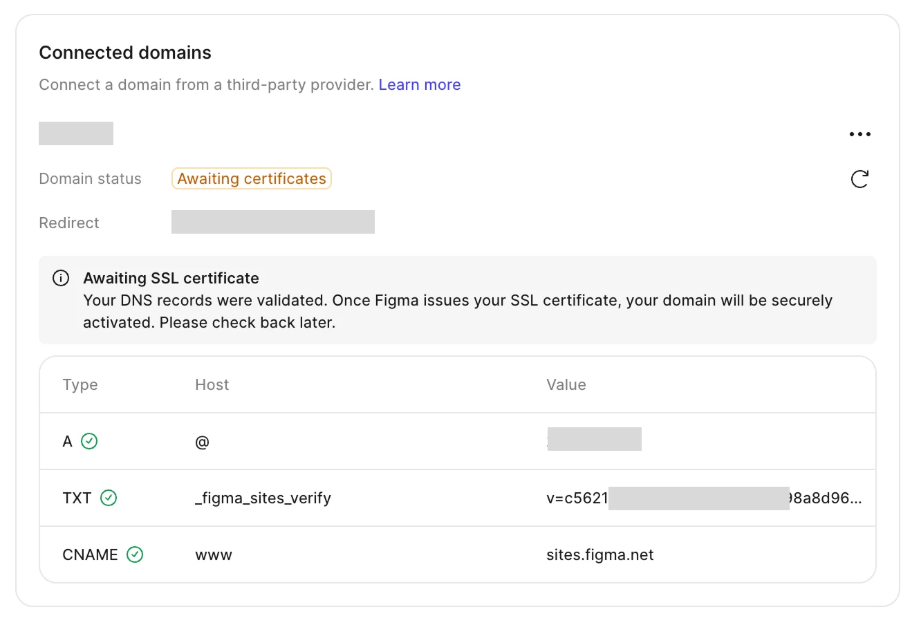 Your DNS records were validated. Once Figma issues your SSL certificate, your domain will be securely