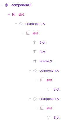 The situation is that I have componentA with slot and componentB with slot, then nest componentA instance inside componentB’s slot. The issues happen when I try to work with the elements inside the slot of componentA instance. The layer panel looks like below.