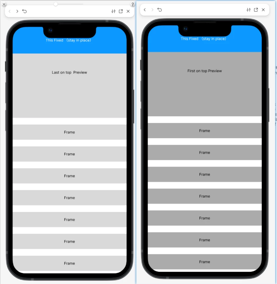 On the left side, the “Last on top” setting is applied, so the “Fixed” frame appears above “Frame 3.”